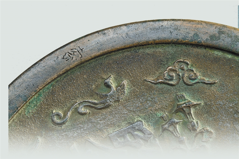 “真容无鉴”字间间隔的“倒挂金钟”花形纹在中国文化中有“警钟长鸣”的寓意,提醒人们要有时刻保持警惕之心。靠近镜缘一周,夔(kuí)凤纹与祥云纹相间。凤纹、祥云纹是我国传统吉祥图案,也是极具代表性的中国文化符号,表达了吉祥、喜庆、幸福的愿望以及对生命的美好向往。
