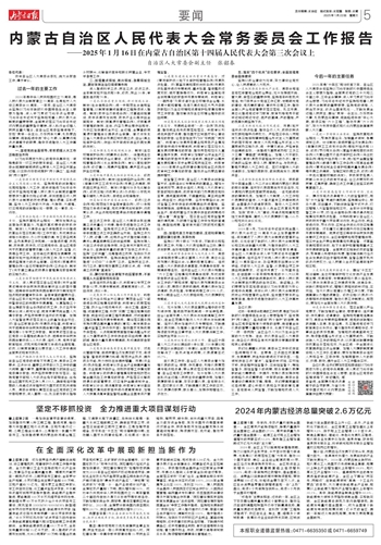2025年是“十四五”规划收官之年。自治区人大常委会将坚持以习近平新时代中国特色社会主义思想为指导,全面贯彻党的二十大和二十届二中、三中全会精神,深入学习贯彻习近平法治思想、习近平总书记关于坚持和完善人民代表大会制度的重要思想,坚持党的领导、人民当家作主、依法治国有机统一,不断发展全过程人民民主,围绕“贯穿一条主线、办好两件大事、弘扬蒙古马精神、闯新路进中游”中心大局,接续实施“六个工程”,推动开展“六个行动”,努力为书写中国式现代化内蒙古新篇章贡献人大力量。