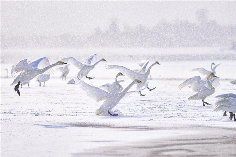 1月27日,在山东省荣成大天鹅国家级自然保护区,大天鹅在雪中展翅。近日,受寒潮影响,我国多地迎来降雪天气。新华社发