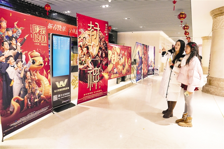 1月29日,走进兴安盟乌兰牧骑宫影城,影院大厅布置得红红火火,热闹喜庆的氛围扑面而来,多部贺岁档影片“同台竞技”,吸引了众多市民前来观影,享受假期沉浸式视听盛宴。本报记者 高敏娜 摄