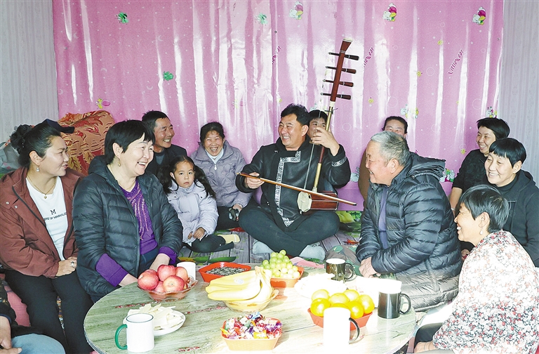 在通辽市科左后旗朝鲁吐镇更给嘎查新艾里小组民间艺人白泉家,村民们围坐在一起,脸上洋溢着幸福的笑容,聆听着好来宝的悠扬旋律。白泉满怀激情地弹奏起熟悉的曲调,表达着对家乡的深情厚谊和对生活的无限赞美。音乐、笑声与交谈声交织融合,共同勾勒出一幅温馨和谐的乡村画卷。