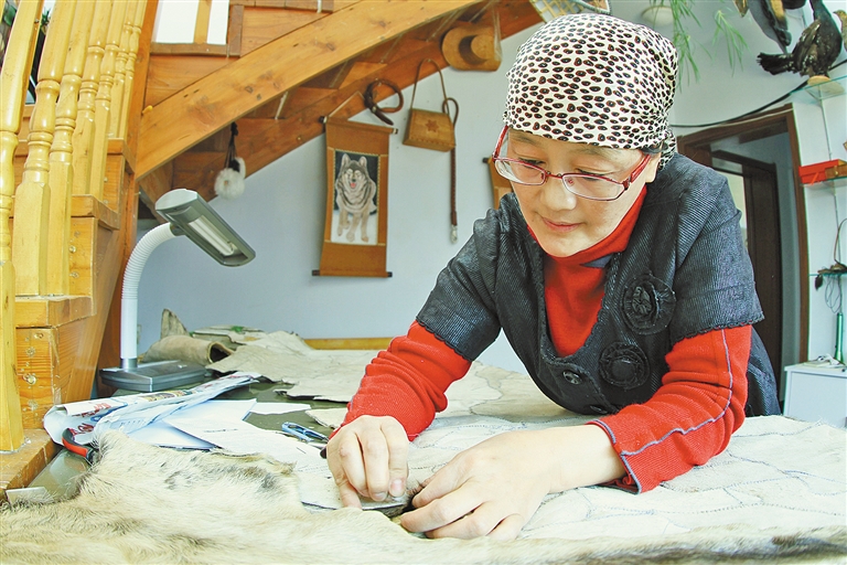 “缝制兽皮画看似不复杂,其实要靠无数次的机缘。”现在,最煎熬的是兽皮的收集,她说,“每一幅兽皮画都是独一无二的,要由几十块甚至上百块驯鹿小腿上的皮毛组成,即使颜色合适,还要看毛的走向,必须是完美统一的才称得上作品。”