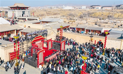 2月1日,游客在老包头走西口历史文化街区游览。春节期间,包头市老包头走西口历史文化街区人山人海,市民和游客在文化街区赏特色大院、品传统美食、看非遗表演,感受传统文化魅力。