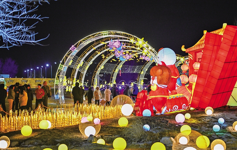 2月2日,呼和浩特市民在小草公园内观赏花灯。春节期间,呼和浩特小草公园、小黑河等地都设置新春灯会,融合了传统文化与现代科技的花灯吸引市民和外地游客前往打卡。本报记者 孟和朝鲁 摄