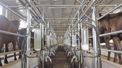 马奶合作社的自动化挤奶设备正在挤马奶。 苏达拉其 摄