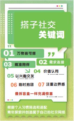 以更加轻松自在的方式感知生活的美好,拥抱不断变化的世界,搭子社交成为青年人主动适应社会发展的交际新表达。中国青年报社社会调查中心联合问卷网曾对1335名受访者进行了调查,结果显示72.6%的受访青年表示自己生活里有搭子,20.0%的青年表示还没有,但有需要会找。“我看到有英语网课组团报可以优惠,想找一个一起学英语的搭子”“天冷风大不想动,是时候给自己安排个运动搭子了”“蹲个拍照搭子”……内蒙古财经大学校内贴吧上,到处都可以看到形形色色的“寻搭启事”。各类社交平台、互联网将年轻人聚集在一起,为找搭子降低了门槛,自嘲“人均社恐”的年轻人们也更愿意通过线上方式建立连接、获得归属感。