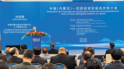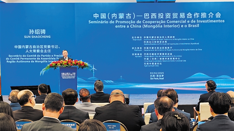 访问巴西期间,孙绍骋首先来到桑托斯港,实地考察港口建设和进出口货物集散情况,出席中国(内蒙古)—巴西可持续大豆战略签约仪式暨共建全球奶业可持续供应链行动倡议签署发布仪式。当地时间2月3日下午,孙绍骋在圣保罗出席“2026 世界杯旗手全球招募暨内蒙古—圣保罗区域启动仪式”,会见圣保罗州代理州长拉姆斯等官员。在随后举行的中国(内蒙古)—巴西投资贸易合作推介会上,孙绍骋发表致辞。他在致辞中说,习近平主席高度重视中巴关系,去年11月访问巴西期间,中巴签署《关于携手构建更公正世界和更可持续星球的中巴命运共同体的联合声明》及一系列合作文件,两国关系进入历史最好时期。内蒙古是中国的一个自治区,同巴西有关地区经济互补性强,在农牧业、新能源、文化教育等领域合作潜力巨大、前景广阔,愿双方携手,共同推动各领域合作取得新突破。同时,期待同巴西有关地区建立和深化友城关系,共同探索合作发展新路径。本次推介会由中国内蒙古自治区人民政府、巴西出口投资促进局共同主办,中巴双方共有200余家企业参加,签署合作项目、协议17个,涉及种植业、化工、新能源、食品及乳业等多个领域,签约金额近100亿元。