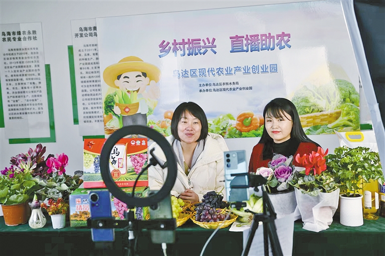 “家人们,今天我们带来的是秀梅家的奶油草莓、雨润三禾的小柿子、果紫农业的有机蔬菜……”2月7日,在乌海市乌达现代农业产业园直播间,乌达区农牧水务局副局长马烨熟练地打开直播设备,与各家农户同台讲解,与网友实时互动,不时分享有趣的农区故事,主播范儿十足。