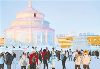 2月9日,游客在哈尔滨冰雪大世界游览。冰雪旅游热门目的地黑龙江哈尔滨在第九届亚冬会的带动效应下,吸引了众多国内外游客前来赏冰乐雪,感受冰雪之美。 新华社记者 侯俊 摄
