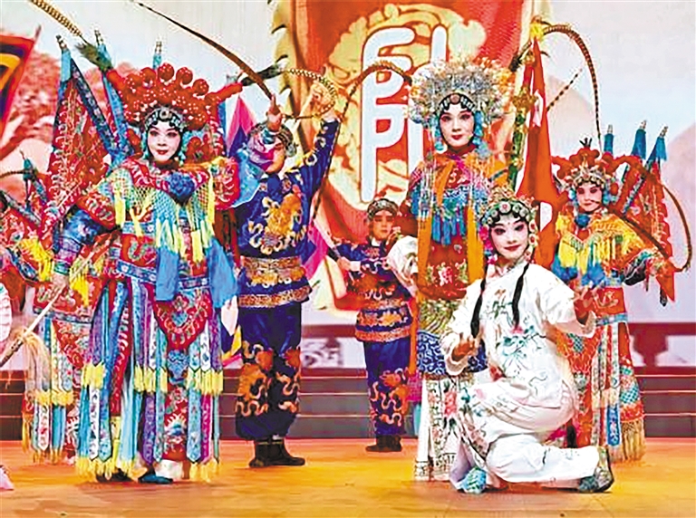 在《繁花巳锦· 北疆春》的舞台上,“小众”地方戏婺剧与“国戏”京剧等无缝对接,形成了戏曲类别的有机融合。前者,一位年轻女演员用与京剧“桌子功”相对的“椅子功”,将折子戏片段《挂画》表演得炉火纯青,后者则以人们耳熟能详的大戏《穆桂英挂帅》的唱腔,赢得了观众的掌声。