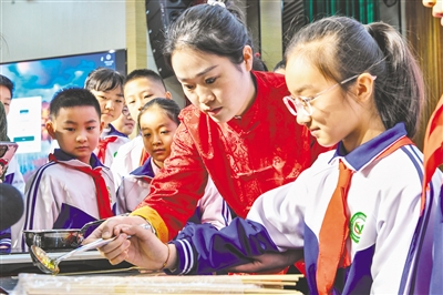 2月24日,在吉林省第二实验朝阳学校,糖画艺人董露露(右二)指导学生制作糖画。当日是吉林省长春市中小学开学第一天。吉林省第二实验朝阳学校将非遗融入开学第一课,让学生们体验传统文化的独特魅力。 新华社记者 张楠 摄