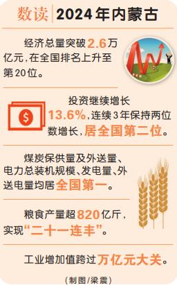 2024年,内蒙古完成防沙治沙面积1954万亩;新能源建设领跑全国,煤炭保供量及外送量、电力总装机规模、发电量、外送电量均居全国第一,稀土产业产值突破千亿元;粮食产量超820亿斤,实现“二十一连丰”;陆路口岸货运量突破1.2亿吨。