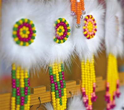 “太阳花”,鄂温克族传统手工艺品。圆心象征着太阳,四周毛针象征着阳光,寓意着温暖、吉祥。如今,“太阳花”已经成为呼伦贝尔市鄂温克族自治旗畅销的文创产品,带动当地热爱传统手工艺品制作的人们共同走上致富路。