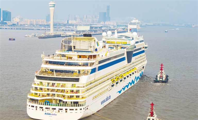3月16日,“阿依达·星辰号”邮轮航行在上海吴淞口国际邮轮港水域(无人机照片)。当日,德国AIDA邮轮公司旗下“阿依达·星辰号”和皇家加勒比的“海洋光谱号”靠泊上海吴淞口国际邮轮港,两艘大型国际邮轮共带来近4800名外籍游客入境。这是上海吴淞口国际邮轮港自2011年开港以来创造的单日入境外籍游客数的最高纪录。 新华社发