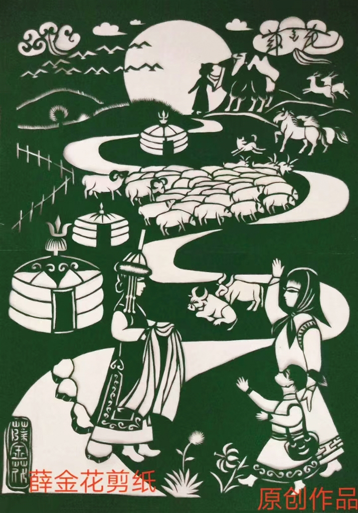 从此,在薛金花的剪纸图案里,又多了蒙古包、勒勒车、挤奶等蒙古族元素。