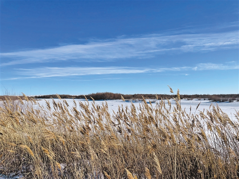 3月上旬,呼伦贝尔市新巴尔虎左旗境内的哈拉哈河冰雪尚未消融,河面上覆盖着皑皑白雪,金黄的芦苇荡与蓝天白云相映成趣。