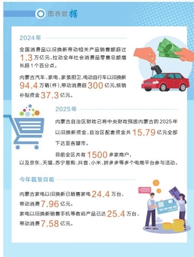 2024年底召开的中央经济工作会议提出,持续支持“两重”项目和“两新”政策实施。2025年开年以来,内蒙古消费市场迎来了新一轮政策红利——以旧换新政策在原有基础上全面升级,覆盖范围更广、补贴力度更大、绿色智能化程度更高。这些政策不仅聚焦传统家电、汽车等领域,更首次将手机、平板等数码产品纳入国家补贴范围,全区消费潜力加速释放,为经济稳步发展再次注入强劲动能。