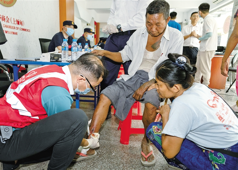 4月5日,在缅甸曼德勒,中国香港特区救援队队员为灾区民众诊疗。当日,多支中国救援力量在缅甸曼德勒开展医疗巡诊,为当地灾区民众提供“零距离”诊疗服务。