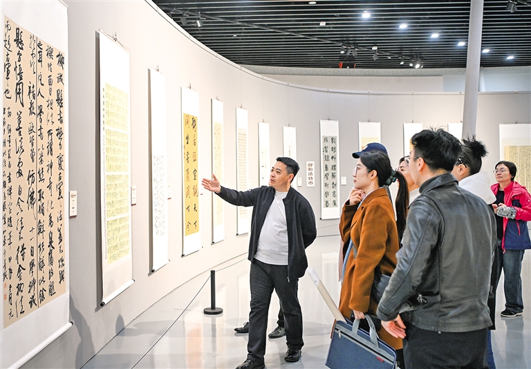 4月3日,呼和浩特市民正在欣赏书法作品。当日,“翰墨中华·赓续文脉”——内蒙古自治区优秀书法作品展在内蒙古美术馆开展,本次展览入展作品186件,作品取法多元,风格多样,笔精墨妙。据了解,本次展览部分精品还将赴全国部分省市巡展。本报记者 孟和朝鲁 摄