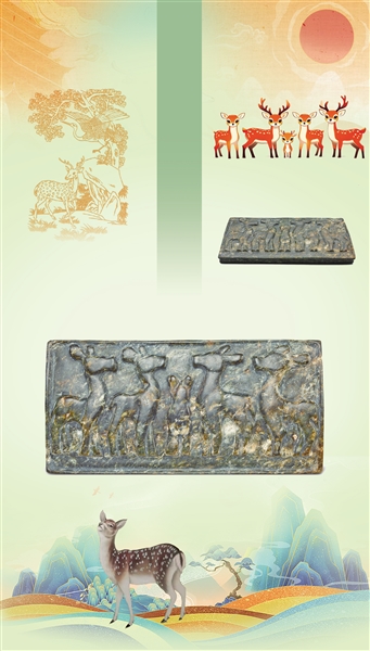 五鹿同春玉牌形状规整典雅。玉牌上高浮雕刻绘着5只鹿,左右各2只,两两相对,守护着中间反立的小鹿,形象生动逼真,仿佛随时会跃出玉牌,奔向密林深处。