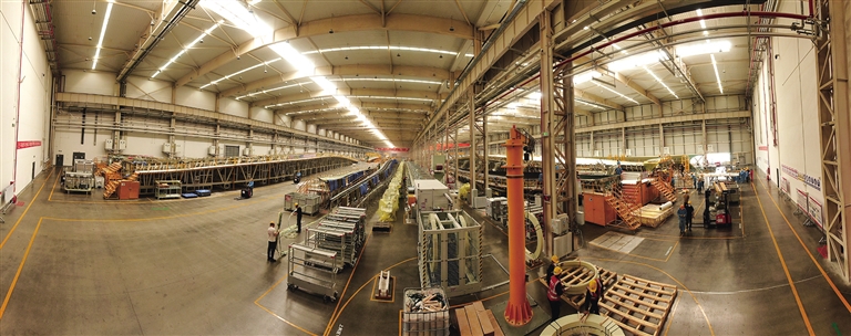 在三一重能股份有限公司风电智能制造产业园项目生产车间,机器的轰鸣声此起彼伏,数十名工人干劲十足地工作在风机叶片生产的各个作业面,一派繁忙有序的“奋斗模式”正火热展开。据项目负责人介绍,当前车间赶付的是来自乌兰察布的订单,交付任务很紧,车间也加足马力,全线投入生产。“当前平均日产量可下线3支叶片,根据叶片长度的不同,车间生产周期在36小时到48小时不等。”三一重能股份有限公司风电智能制造产业园副总经理严通说。