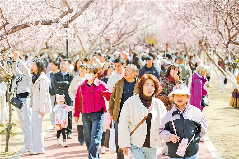 在“赏花经济”带动下,周边的小市场也火了起来,各式各样的美食映入眼帘,套圈、旋转木马、小火车等游乐项目让孩子们尽情玩耍。市民李丽激动地说:“桃花盛开的季节,能在家门口来个赏花一日游,感受满满的城市烟火气,真是一种享受。”