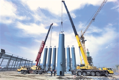 4月14日,在巴彦淖尔市中科化工有限公司年产2万吨糠醛项目建设工地,工人正在吊装水碱锅。据了解,该项目位于巴彦淖尔乌拉特前旗工业园区,通过将农村废弃玉米芯水解和精制后提取糠醛。项目占地面积102亩,总投资2.57亿元,建成投产后,年产值约1.6亿元,年均上缴利税1600多万元。本报记者 薛来 摄