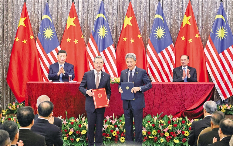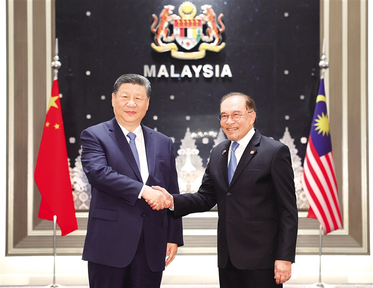 二是凝聚发展合力,打造高质量发展合作标杆。■下转第2版 ■上接第1版 中国致力于以高质量发展全面推进中国式现代化,同马来西亚“昌明经济”计划异曲同工。双方要携手培育壮大数字经济、绿色经济、蓝色经济、人工智能等前沿合作,加强产业链、供应链、价值链、数据链、人才链融合发展。推动传统领域合作转型升级,促进双向投资。推进铁海联运,实现“两国双园”提质升级,将马来西亚重要港口打造成“陆海新通道”重要枢纽。