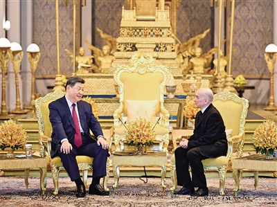 习近平指出,很高兴在西哈莫尼国王登基20周年和柬历新年之际应邀访问美丽的柬埔寨,谨向柬埔寨人民致以新年祝福。柬埔寨国家建设事业蒸蒸日上,相信在西哈莫尼国王庇佑下,勤劳智慧的柬埔寨人民一定能把国家建设得更加繁荣富强。