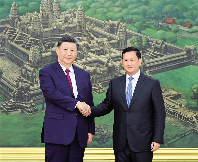 习近平指出,中柬铁杆友谊拥有深厚历史积淀、牢固政治基础、强大内生动力。无论国际风云如何变化,两国始终走在构建人类命运共同体前列。当前,世界百年变局加速演进,深化中柬命运共同体建设完全符合两国人民根本利益。中方将一如既往支持柬埔寨走符合本国国情的发展道路,支持柬埔寨政府顺利施政,支持柬方在国际和地区事务中发挥更加重要作用。双方要以构建新时代全天候中柬命运共同体为新起点,乘势而上,继续落实好新版中柬命运共同体行动计划,加强团结合作,加快落实全球发展倡议、全球安全倡议、全球文明倡议,深化更高水平政治互信,拓展更高质量互利合作,筑牢更高层次安全保障,开展更高频率人文交流,强化更高标准战略协作,更好造福两国人民。