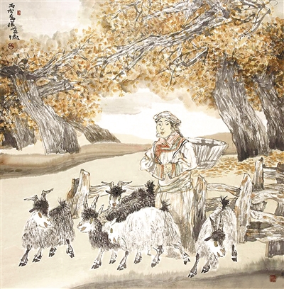 张峻德的这类作品以鄂尔多斯草原蒙古族人民生活为主要表现内容,画面没有表面的搜奇猎异,没有大的场面铺排,他善于在牧人平凡的日常生活中发现绘画的题材内容,并将其表现得意趣盎然,充满“诗情画意”。在这类作品中,张峻德的绘画优长和特色体现得最为充分。经过几十年的不断实践、潜心探索,张峻德找到了一套属于自己的绘画表现方法,鄂尔多斯草原特有的生灵与景致,如山羊、漠野、草滩、红柳、沙蒿、栅栏、篱笆这些在中国传统绘画中没有现成图式可资借鉴的景物,都被他充分利用,与人物结合,表现得笔墨酣畅,韵味十足,为表达主题起到了积极作用。