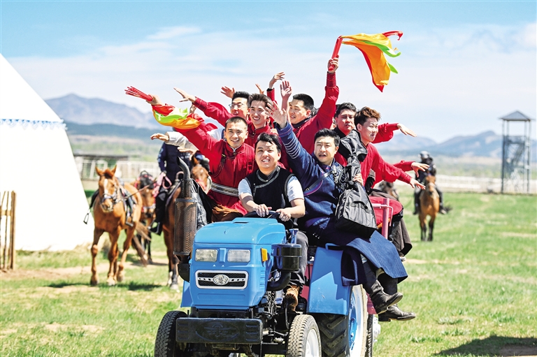 5月1日,乌兰牧骑队员在敕勒川草原为游客表演节目。“五一”期间,呼和浩特市乌兰牧骑原创实景演艺剧目“欢腾的敕勒川”在敕勒川草原精彩上演,以“演出+旅游”观演和互动相融的模式,向全国游客展现北疆风情。本报记者 王磊 摄