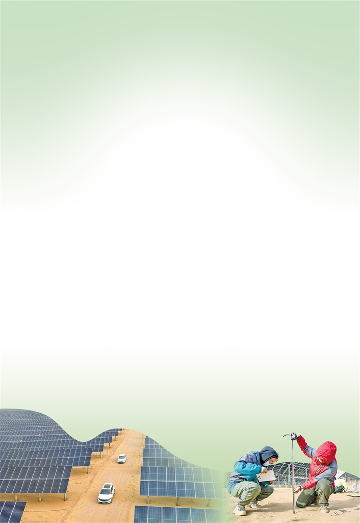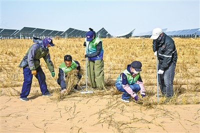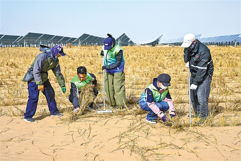 与此同时,三北治沙青年突击队技术指导组的队员苏慧和小伙伴们正在磴口县乌兰布和沙漠东北部新能源基地200万千瓦光伏发电先导工程区与工人们一起开展草方格压沙工作。1996年出生的苏慧是磴口县防沙治沙局业务科室的员工,参加工作不到两年时间,谈起压沙技术头头是道。“一拉二铺三压,拉线铺草压草都有严格要求,刚开始接触这个工作有些困难,不会用巧劲儿,体力上感觉跟不上,现在越来越有技巧,轻松多了。”