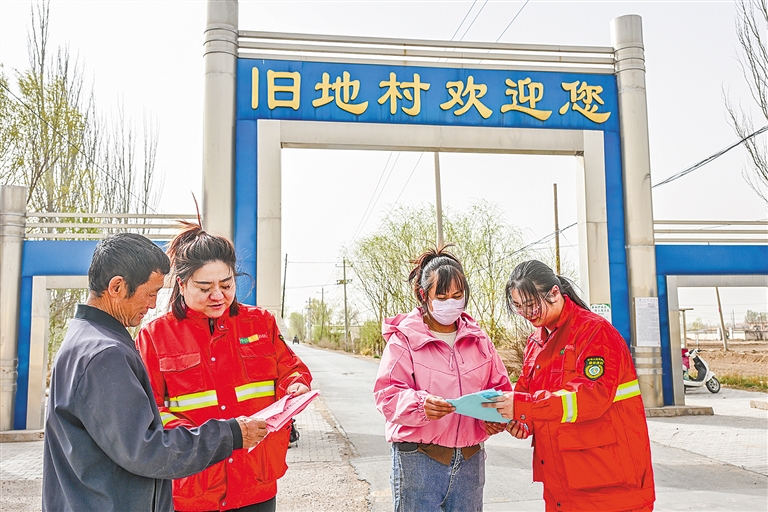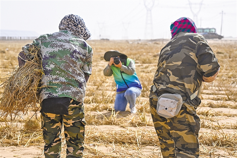三北治沙青年突击队宣传报道组成员崔冉昕乐观爱笑,总是抱着相机到处跑,她自嘲是青年突击队里的老人,其实也刚满35周岁。“我想把治沙人最美的一面展示出来,看着沙漠变绿洲的过程很治愈。”崔冉昕对治沙人有着特殊的情感,他的父辈作为土生土长的磴口人,治沙40载,自幼在沙漠环境中长大,吃着沙子拌饭、睡在沙窝铺,他们那代人从小就立志让大漠变为绿洲。1997年出生的张乐天是磴口县团委副书记,作为宣传报道组成员,她的一项重要工作就是宣讲磴口模式下的感人故事,采访收集素材、写演讲稿、口才训练,怀孕三个月的她不辞辛劳上下奔波。“为了让更多人了解防沙治沙工作,讲述党领导下的防沙治沙磴口故事, 我觉得很有意义,身边的治沙故事也在感染着我。”
