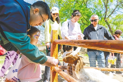 5月2日,游客在呼和浩特市玉泉区林下郊野萌宠乐园喂食小动物。郊野萌宠乐园设有多个萌宠互动区域,游客在这里能与很多小动物亲密接触,通过这种零距离互动,游客增进了对萌宠的了解与喜爱。“五一” 假期,这里还开展了欢乐小丑嘉年华、奥特曼主题表演等丰富多彩的活动,成为周边热门打卡地。本报记者 王磊 摄