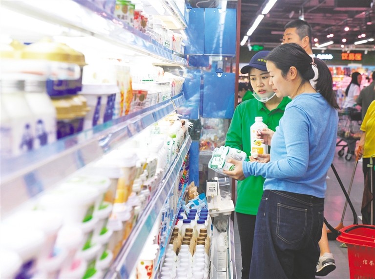 5月5日,消费者在河北石家庄新乐市一家超市选购乳制品。2025年“五一”假期,全国消费市场繁荣活跃。据商务部商务大数据监测,假期全国重点零售和餐饮企业销售额同比增长6.3%。其中,以旧换新备受欢迎,服务消费持续升温,餐饮文旅市场红火。 新华社发