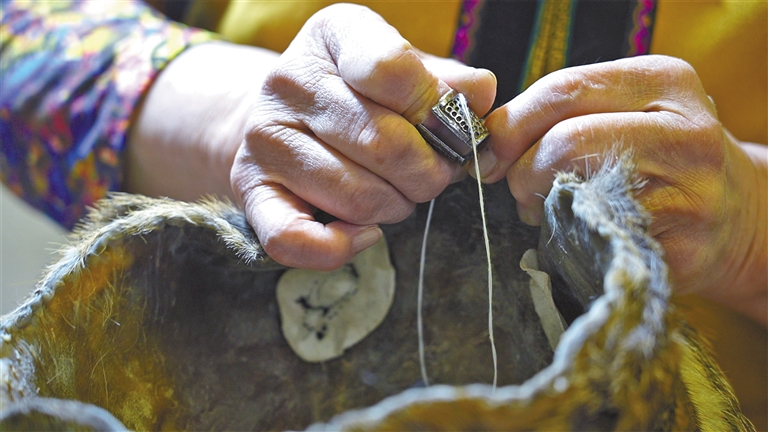 满古梅说,自己是家族第五代传人,做了几十年民族传统服饰的她,熟练掌握选料、熟皮、裁剪、缝制、染色、防虫、防潮、防腐8大制作工艺,能够制作鄂伦春族狍皮服装、狍角帽、考浩捞(手套)等狍皮制品。