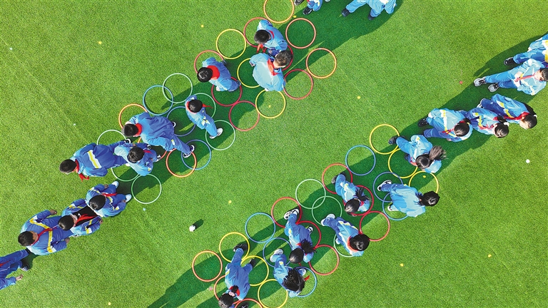 课间时间,呼伦贝尔市扎兰屯市实验小学学生正在集体跳敏捷圈。该小学积极探索智慧体育、跨学科体育等创新模式,大力推广趣味体育大课间活动,让学生们享受体育运动带来的乐趣,全面落实“双减”政策。韩颖群 摄