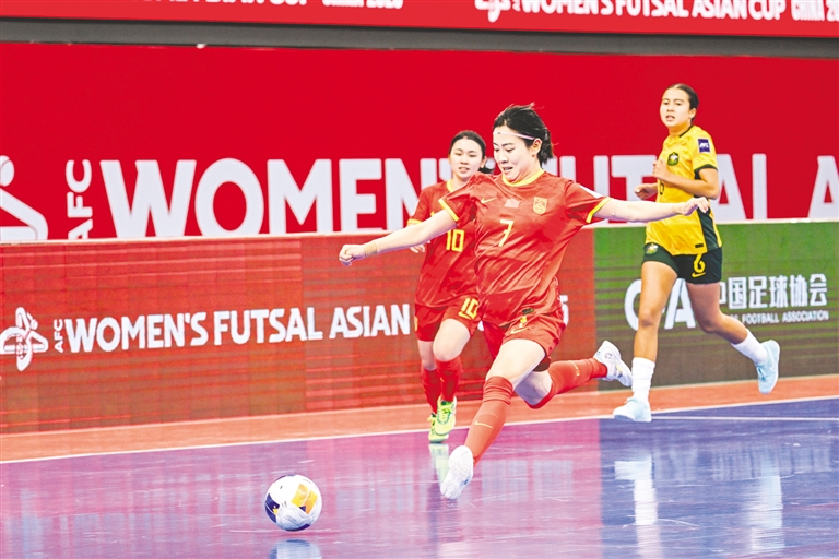 5月6日,中国女子五人制足球队队员在比赛中激烈角逐。当天,2025亚足联中国女子五人制足球亚洲杯决赛在呼和浩特市开幕。在小组赛首场较量中,中国队以3比1击败澳大利亚队。据悉,本次赛事为亚足联最高级别的女子五人制A级赛事和世界杯预选赛,也是呼和浩特市迄今承办档次最高的洲际体育赛事。本报记者 王晓博 摄