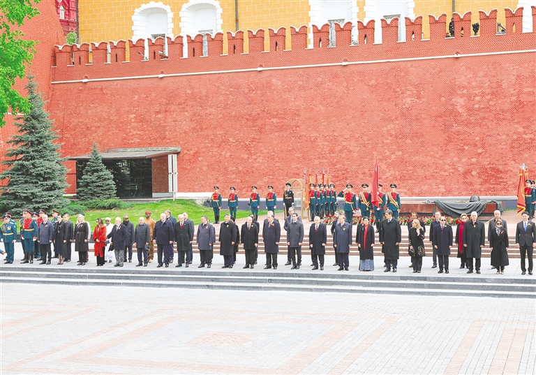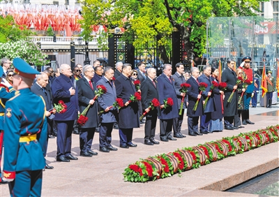 庆典结束后,习近平同其他国家领导人一起从红场来到亚历山大花园,向无名烈士墓献花,并肃立默哀。随后,各国领导人集体合影留念。