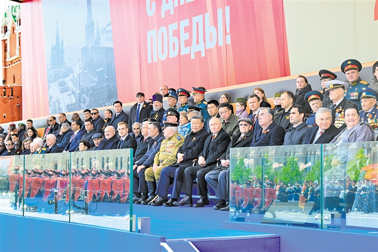5月的莫斯科,绿意盎然,鲜花盛开,胜利日旗帜迎风招展,恢宏的红场一片庄严的盛典气氛。
