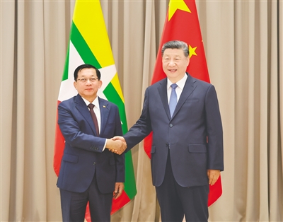 习近平指出,中缅是同甘共苦、守望相助的命运共同体。中缅两国共同倡导的和平共处五项原则和万隆精神历久弥坚,时代价值不断凸显。今年是两国建交75周年,中方将秉持睦邻、安邻、富邻、亲诚惠容、命运与共的理念方针,同缅方深化命运共同体建设,高质量共建“一带一路”,落实好全球发展倡议、全球安全倡议、全球文明倡议,给两国人民带来更多福祉。前不久,缅甸曼德勒强烈地震造成重大人员伤亡和财产损失,中方最早派出救援力量,援助紧急人道主义物资,愿继续提供帮助,支持缅方重建家园。中方支持缅甸走符合本国国情的发展道路,维护主权独立、领土完整、国家稳定,稳妥推进国内政治议程。双方要深化战略合作,持续推进中缅经济走廊重点项目建设。希望缅方切实保障在缅中方人员、机构、项目安全,加力打击网赌电诈等跨境犯罪。双方要共同捍卫以联合国为核心的国际体系和以国际法为基础的国际秩序,维护发展中国家正当权益。