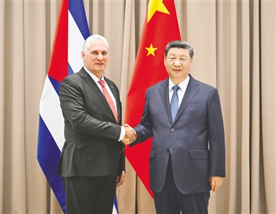 习近平指出,近年来,我同主席同志多次会晤,共同引领中古关系进入政治互信更深厚、战略协作更紧密、民意基础更牢固的新阶段。今年是中古建交65周年,中方愿同古方进一步巩固铁杆情谊,构建更加紧密的中古命运共同体,树立社会主义国家团结合作、发展中国家真诚互助的典范。双方要促进各层级交往、各领域合作进一步走深走实,让高水平政治互信始终成为中古两党两国关系的鲜明标识。中方坚定支持古巴捍卫国家主权、反对外来干涉和封锁,支持古巴经济社会发展。作为全球南方重要成员,双方要在金砖、中拉论坛等框架内加强协调和配合,反对强权政治和单边霸凌,维护国际公平正义。