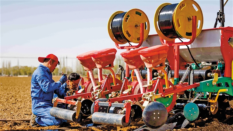 连日来,巴彦淖尔市抢抓土壤墒情较好有利时机,开展大田玉米播种作业。在临河区的农田里,伴随着机器的轰鸣声,一台台搭载北斗导航系统的播种机正开足马力,按照预设路线匀速前进,一粒粒饱满的玉米种子连同肥料被精准地播撒进土壤。近年来,巴彦淖尔市大力实施“藏粮于地、藏粮于技”战略,通过科技赋能,充分挖掘地、种、肥、药各要素和耕、种、管、收全程机械化耕作的增产潜力,从政策补贴、技术指导、机械作业、气象服务等多方面发力,实现良田良制并举、良种良法相配套、农机农技相融合,构建起规模化种植产业新格局,逐步实现农业现代化。