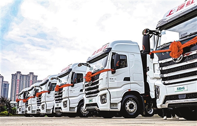 在下游应用端,绿氢在交通运输领域的应用尤其广泛。走进鄂尔多斯市国鸿氢能科技有限公司,一辆辆红色氢燃料重卡格外吸睛。“每辆车配10个氢气瓶,共36kg氢气,能跑300公里,也就是正常卡车一天的里程。与传统电动汽车相比,氢燃料电池车具备加氢速度快、低温损耗小、续航里程长等突出特点。”公司副总经理罗伟介绍。鄂尔多斯现有煤炭中短途运输车18万辆、工程卡车15万辆,氢能应用前景广阔。
