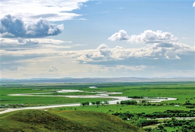 在额尔古纳国家湿地公园,登上刻有“亚洲第一湿地”标志的山顶观景台,远处的山峦、近处蜿蜒流淌的根河与额尔古纳市容市貌尽收眼底。