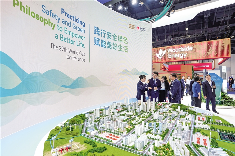 5月20日,与会嘉宾在第29届世界燃气大会北京燃气集团展区参观交流。当日,以“赋能可持续未来”为主题的第29届世界燃气大会在北京国家会议中心举行,这是世界燃气大会首次在中国举行。据介绍,本届世界燃气大会将举办80余场高规格专题论坛,涵盖LNG发展、天然气与可再生能源耦合、能源安全、数字化转型等领域,400余位嘉宾将就行业趋势与技术革新展开深入交流。大会同时举办展览,面积达5万平方米,为历届世界燃气大会之最。 新华社记者 鞠焕宗 摄