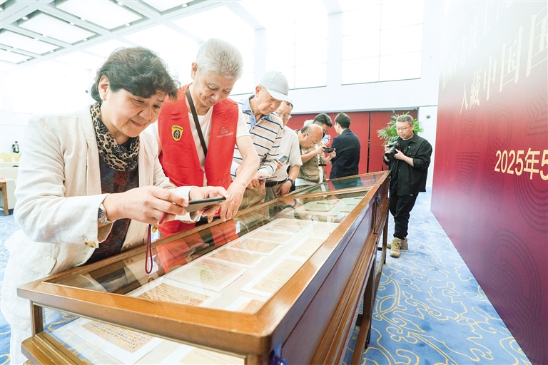 参观者在仪式现场观看新四军老战士沈如峰的战地日记等物品(5月26日摄)。5月26日,“新四军老战士沈如峰战地日记等实物资料入藏中国国家博物馆仪式”在中国国家博物馆白玉厅举行,新四军老战士沈如峰在解放战争时期的战地日记、与家人的往来书信等相关实物资料共21件入藏中国国家博物馆。