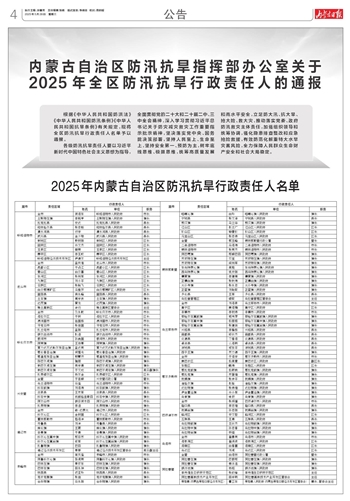 内蒙古自治区防汛抗旱指挥部办公室关于 2025年全区防汛抗旱行政责任人的通报
