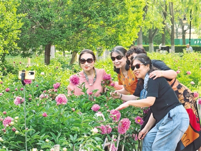 5月28日,在呼和浩特市玉泉区锡林公园,市民游客在芍药花丛中赏花拍照。每年5月底、6月初,锡林公园数千株芍药花次第盛开,成为广大市民游客喜爱的热门赏花打卡点。以花为媒激活“美丽经济”,4月9日至6月29日,呼和浩特市策划并陆续举办14项赏花文旅活动,上演一系列“花”式主题盛会,绽放文旅新活力。本报记者 李卓 摄